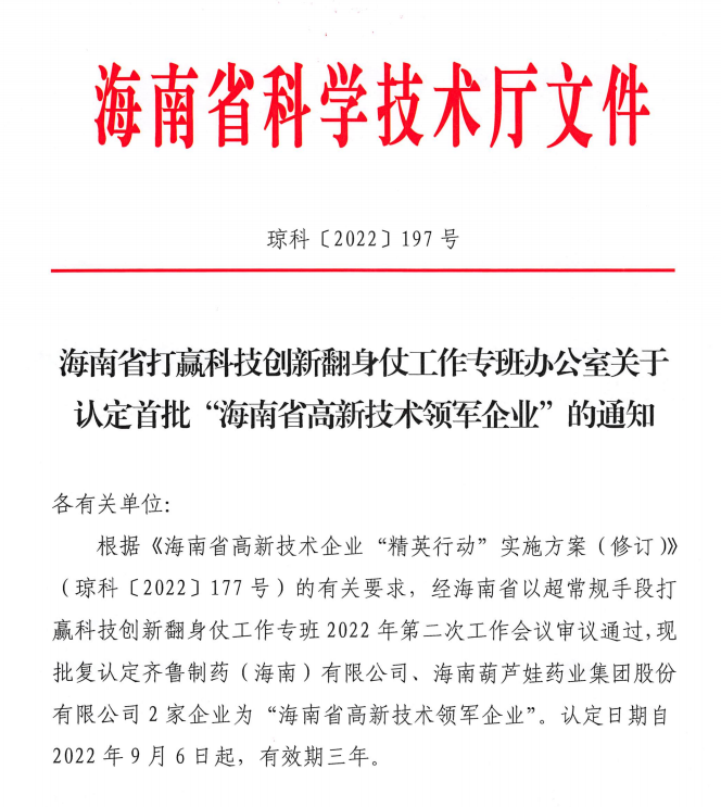近日,海南省科学技术厅发布的《海南省打赢科技创新翻身仗工作专班办公室关于认定首批“海南省高新技术领军企业”的通知》中显示,批复认定海南利博药业集团股份有限公司等2家企业为“海南省高新技术领军企业”。认定日期自2022年9月6日起,有效期三年。